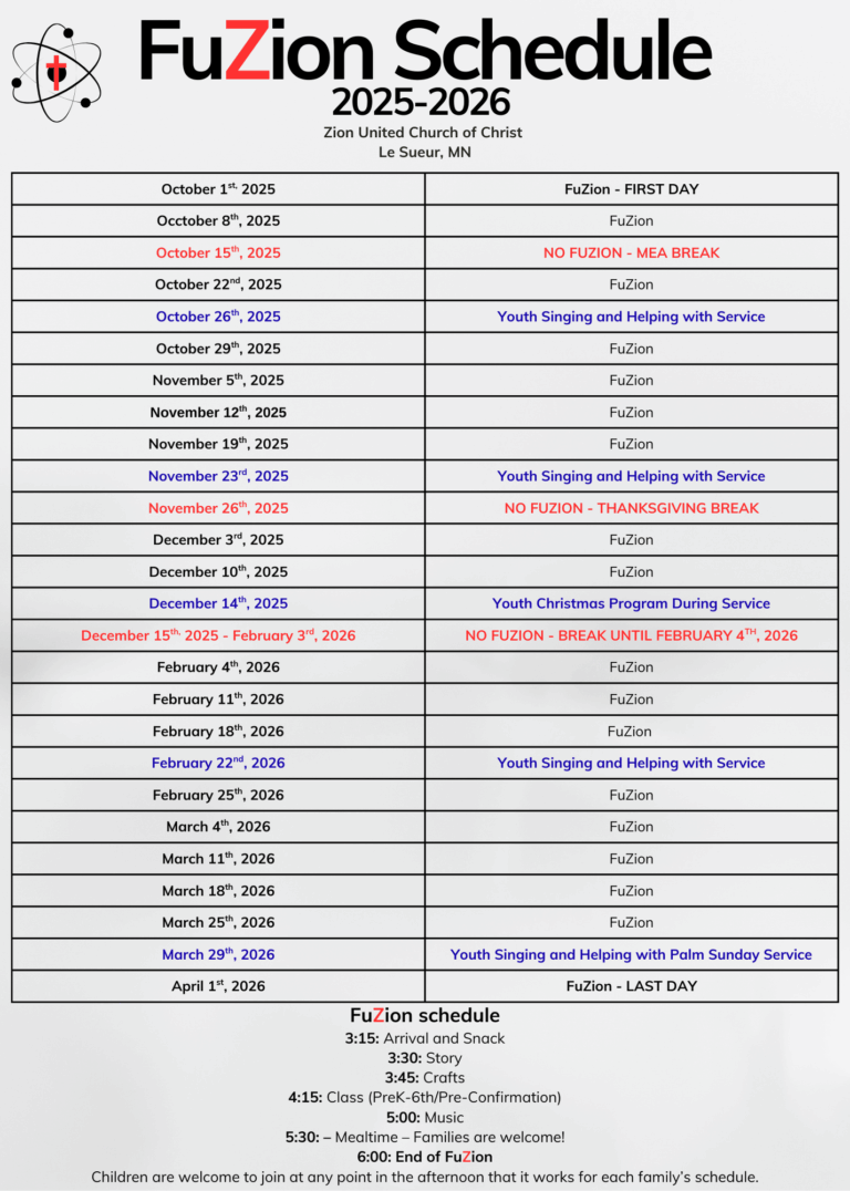 FuZion is a Christ-centered faith formation program at Zion UCC for children in grades K-6. It meets weekly on Wednesdays from 3:10 to 6:00 pm and includes Bible lessons, crafts, games, music, and food. We encourage parents to fill out a registration form for their children. Transportation to the church will be provided for children attending. Click the link above to sign up.